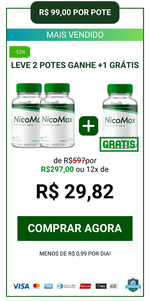 O NicoMax é protegido pela Garantia Blindada, se onde dentro de 90 dias você achar que o suplemento não fez o efeito desejado ou não apresentou nenhuma melhora em seu caso, basta entrar em contato com nossa equipe que iremos lhe devolver 100% do valor investido na hora!